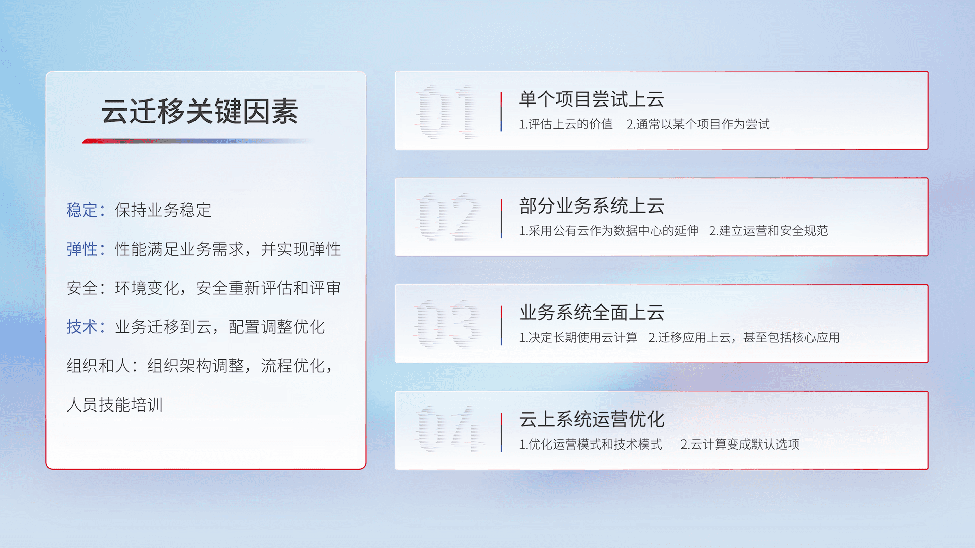 结合实际业务,,从规划设计、、、、云平台选型、、、、云原生改造、、、、数据迁移、、、集成交付,,,,迁移全过程为客户识别最佳上云路径,,,,做好风险识别管理,,,,设计网络架构、、、身份权限、、、、安全审计合规、、、、操作审计、、、日志审计、、、、监控告警策略、、、多站点容灾设计等,,,对云上基础设施进行整体规划,,提升IT治理水平,,以满足弹性、、、、高可用、、高性能的需求。。