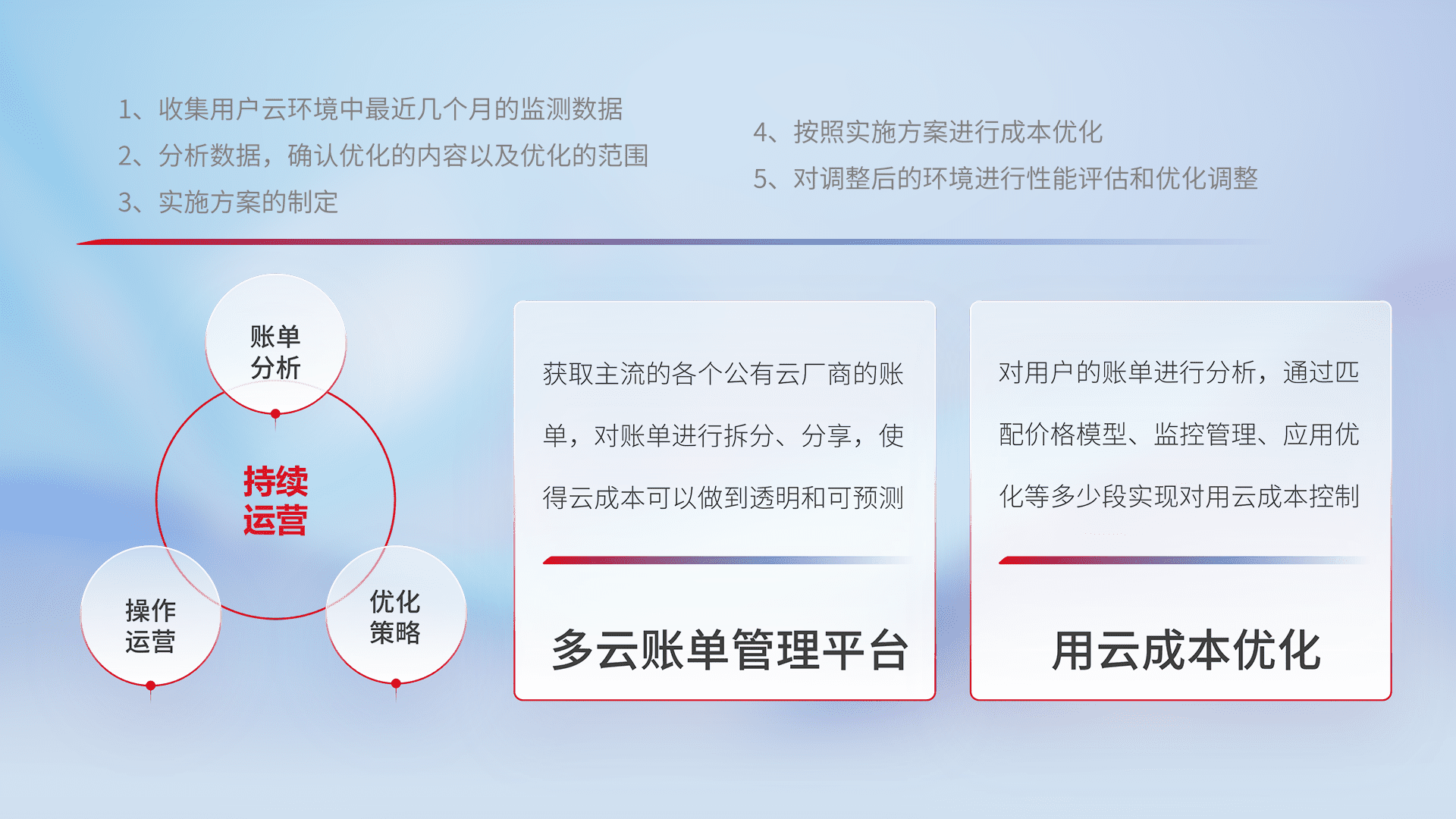 通过多云纳管,,以统一的资源数据模型把客户的云资源进行抽象和封装,,,,进而实现对多云资源的统一操作,,,保障云资源管理的可靠性、、稳定性与可用性。。。。量身定制化运维内容,,,,配置、、开发运维、、补丁管理、、、、备份、、、监控、、、认证和访问管理、、、审计和日常巡检等,,,保障在用云过程中的可靠度,,,稳定度以及高可用率。。。