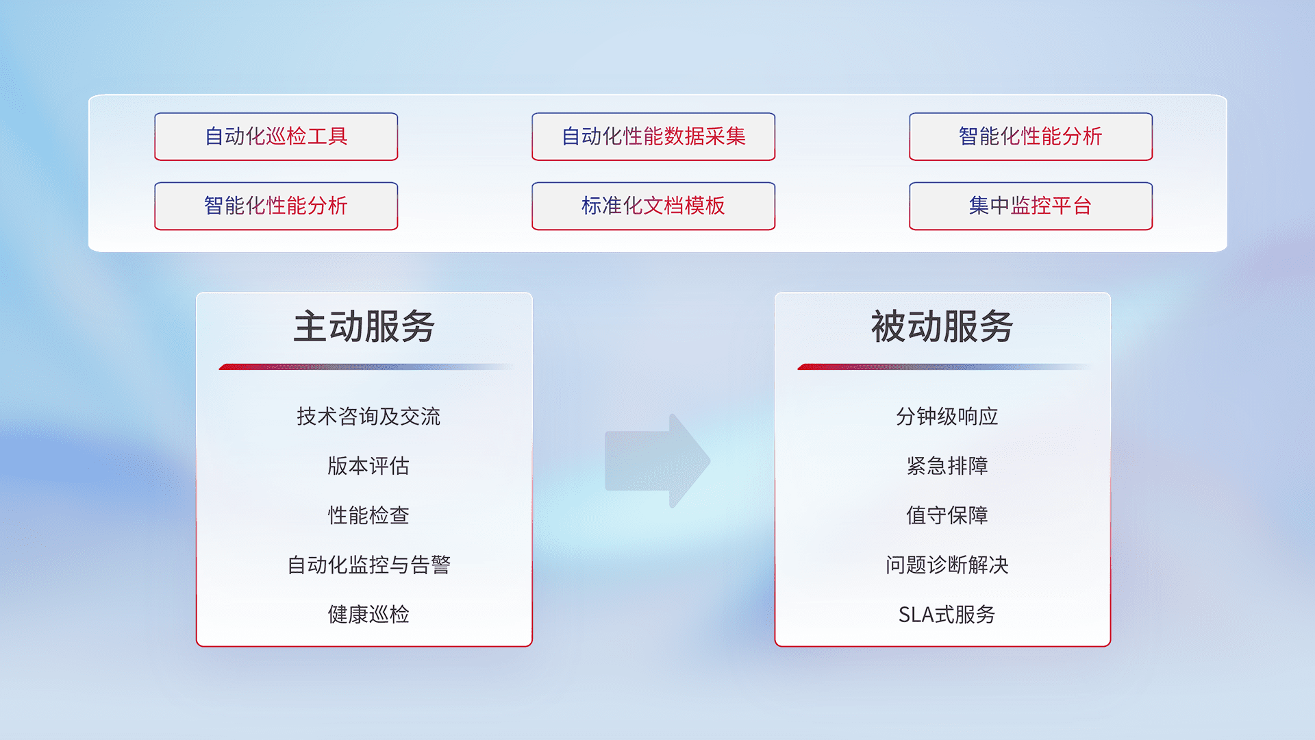 智能化工具和标准化文档,,保障服务质量,,提供主动服务(包含技术咨询、、、版本评估、、、性能检查、、、自动化监控与告警、、、健康巡检)和被动服务包含(分钟级响应、、、、紧急排障、、值守保障、、问题诊断解决、、、、SLA服务)。。