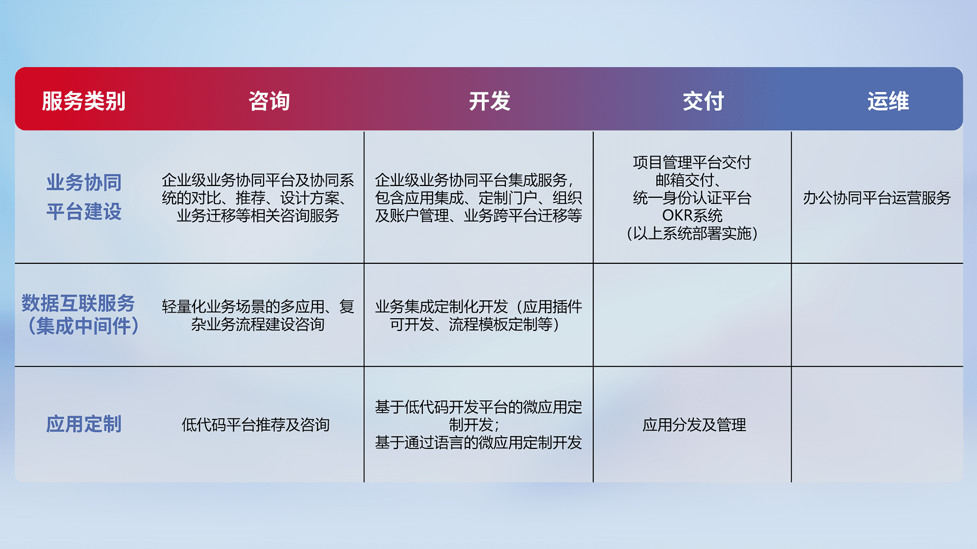 针对钉钉、、、、企微、、IDaas等平台级产品提供产品的规划、、、、方案、、交付、、、定制化开发等服务,,,实现如统一协同办公、、、智能客户服务、、混合会议管理、、、、智能数据查询、、等业务场景,,,实现数字化转型。。。。